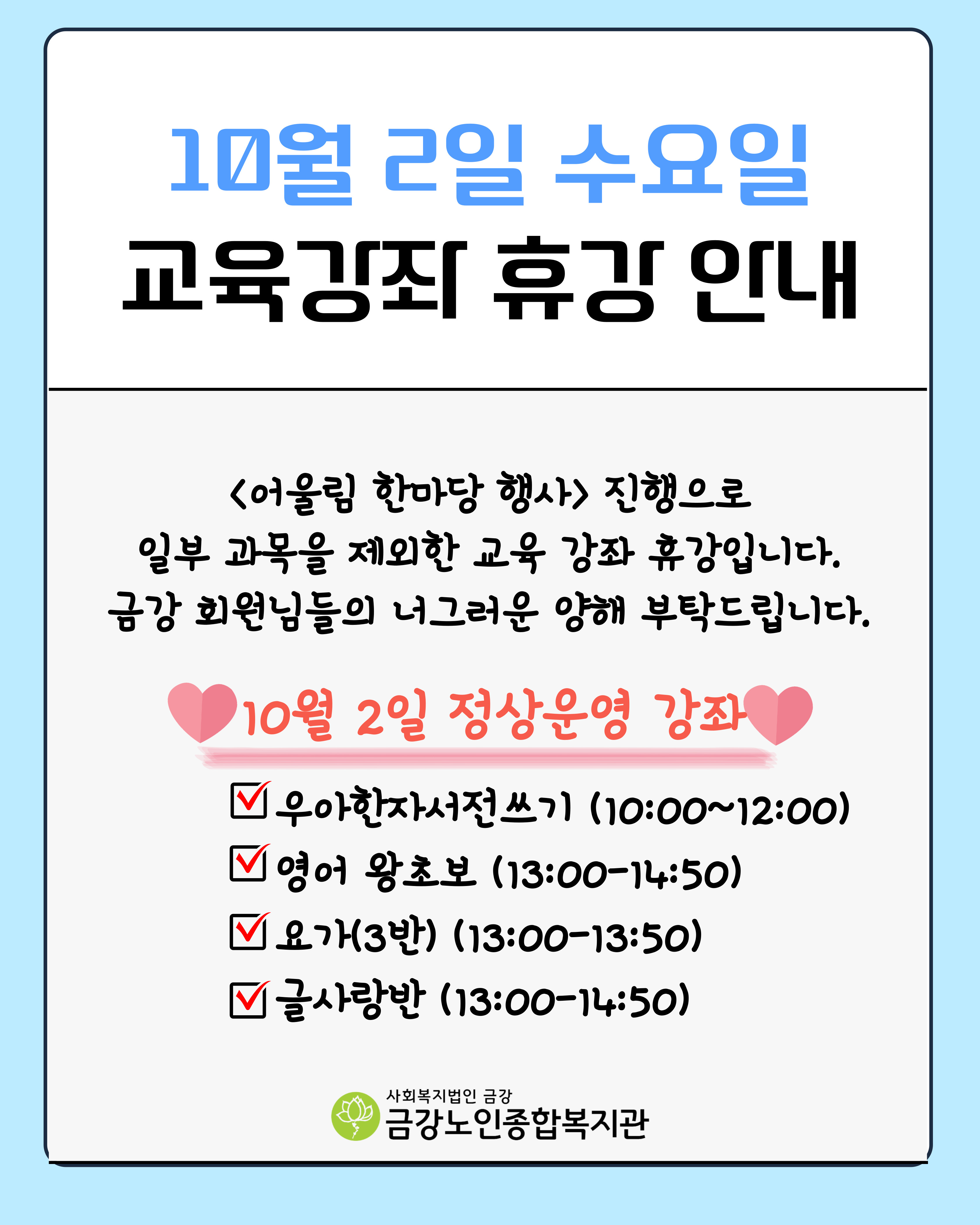 [휴강안내] 10월 2일 수요일 교육프로그램 휴강 안내(일부과목 제외)